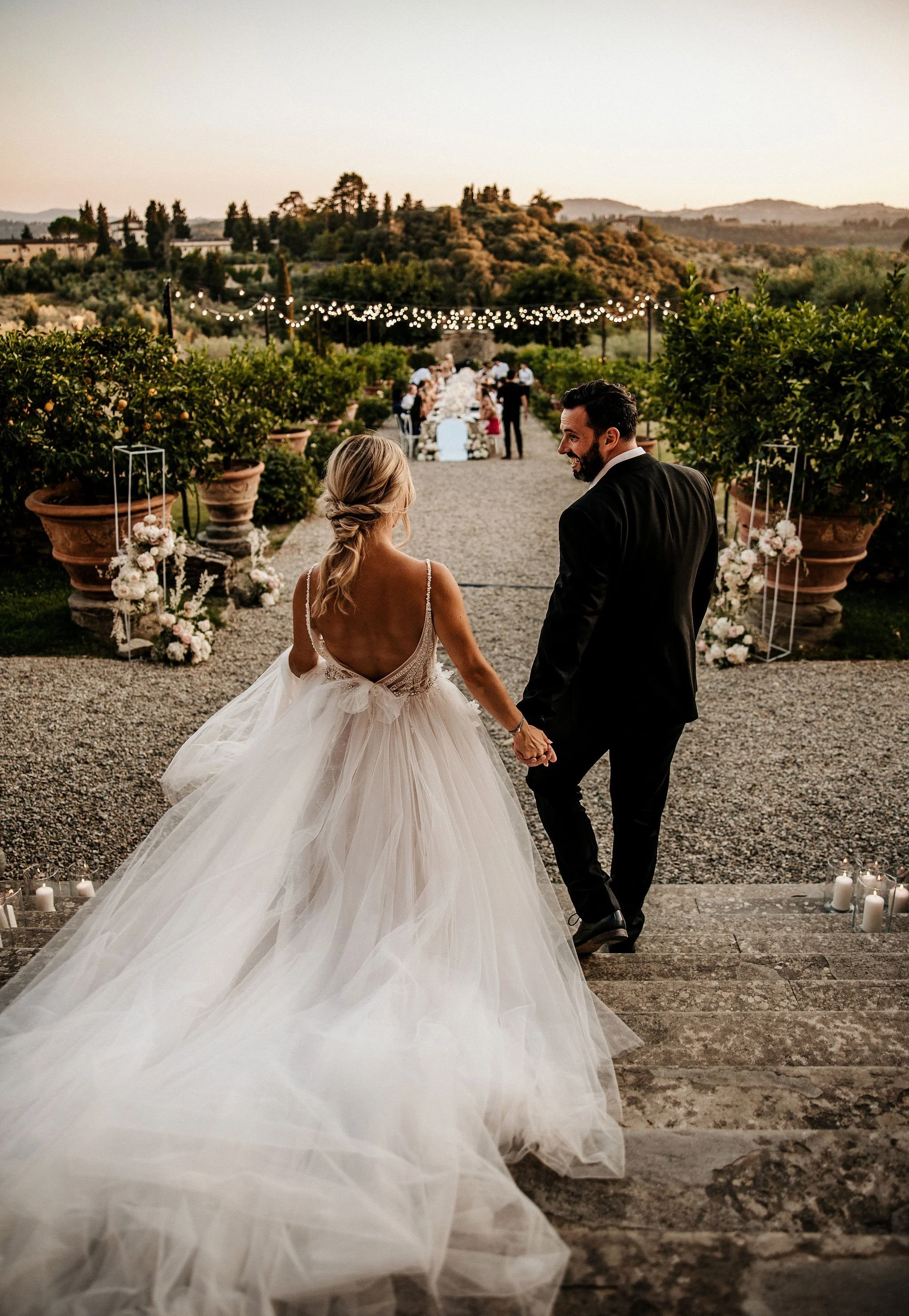 Planning an entire wedding weekend was an important part for Luisa and Dan. We wanted every event to be seamless and a unique experience. Friday started with welcoming the guests in a small villa close to the main location. It was a small, intimate gathering with a classic Italian pizza party. The perfect combination to get together with close family and friends. Of course, Saturday was the big day. The ceremony took place on the property's stunning rooftop terrace, which overlooks Florence. An absolute dream! While the couple floated into the distance for sunset photos, an al fresco cocktail hour took place in the courtyard. When it finally came time for the reception, the villa's massive wooden doors opened to reveal an expansive garden with an elegant long table at its centre, while live music welcomed guests.